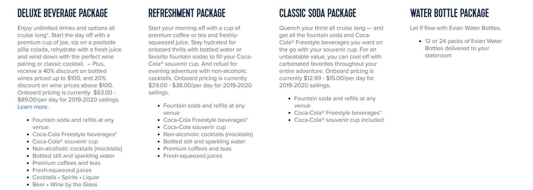 • Všetky doplnkové služby vrátane nápojových balíčkov si cestujúci plánuje pred plavbou na stránke spoločnosti Royal Caribbean Cruise Planner po osobnej registrácii a to čo najskôr po potvrdení rezervácie.