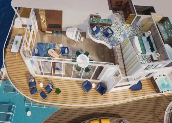 UL - Ultimate Family Townhouse 3-podlažný apartmán. 165 m² + 38 a 23 m² balkóny s výhľadom na more. 7. až 9. paluba vzadu. Max 8 osôb. Výhody Royal Suite Star class. 39 508 € 9 877 € za osobu