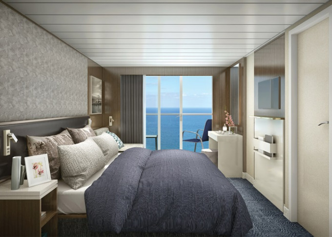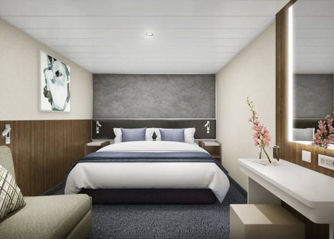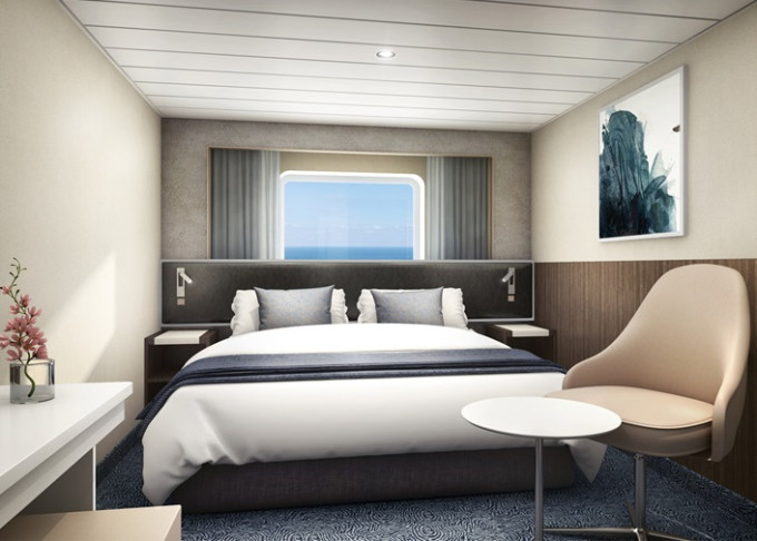 O3 - Vonkajšia kajuta Deluxe 26 m². Veľké neotvárateľné okno. 8. paluba - vpredu. Max 3 osoby. 5 868 € 2 934 € za osobu