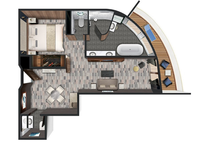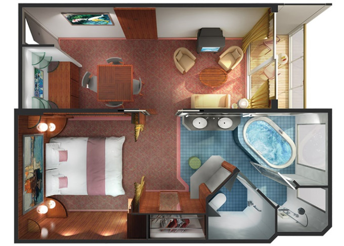 SC - Forward-facing Deluxe Penthouse Suite 51 m² / balkón 10 m². Vírivka. 10. paluba - vpredu. Max 3 osoby. Výhody Suite. 21 228 € 10 614 € za osobu