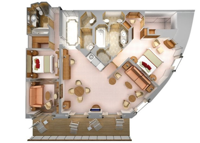 | R2 - Royal Suite 2 127 m² (vrátane 18 m² balkónov). Royal Suite prepojená s Veranda Suite. 7. paluba vpredu. Max 5 osôb. | 33 200 € 33 200 € za osobu |