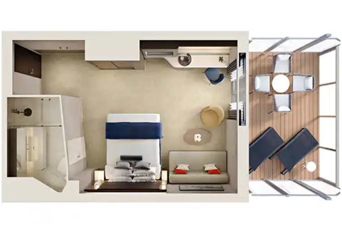 B1 - Kajuta s veľkým balkónom Aft-facing 21 m² / balkón 8 m². 7. až 10. paluba - vzadu. Max 3 osoby. 5 818 € 2 909 € za osobu